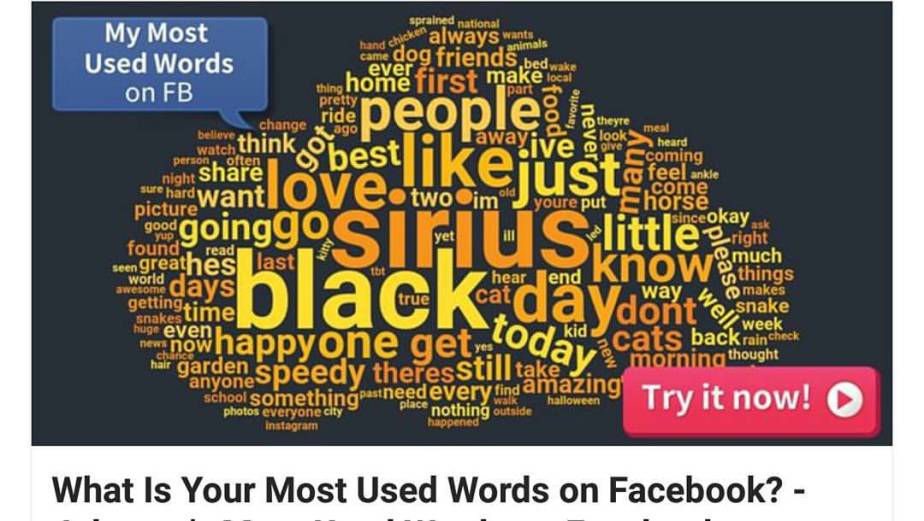 My human’s “most used” words on her Facebook profile. Why am I not surprised to be front & center? Share Adventure Cat Love With: Click to share on X (Opens in new window) X Click to share on Facebook (Opens in new window) Facebook Click to email a link to a friend (Opens in new window) Email Click to share on Reddit (Opens in new window) Reddit Click to share on Tumblr (Opens in new window) Tumblr Click to share on Pinterest (Opens in new window) Pinterest Like Loading... Related